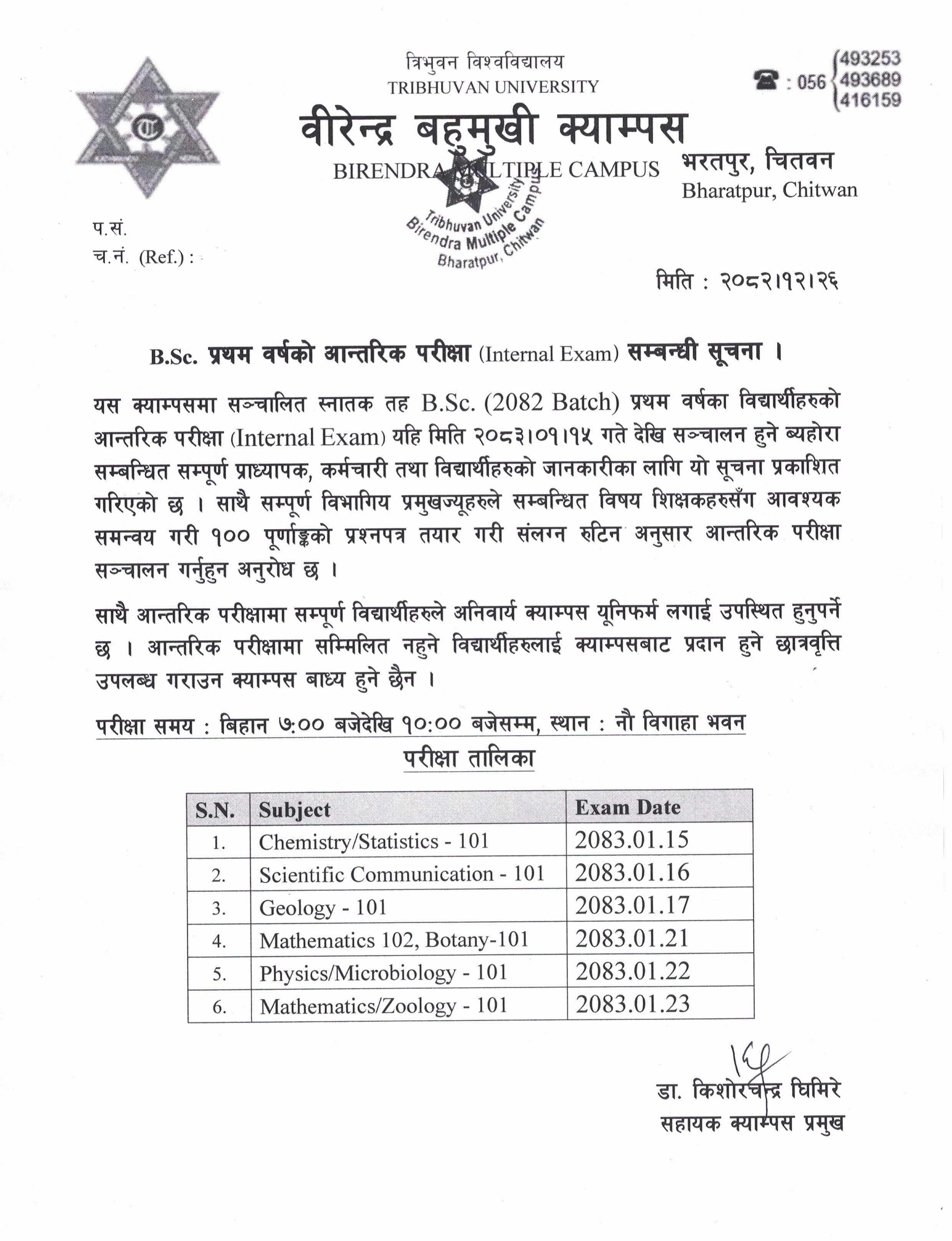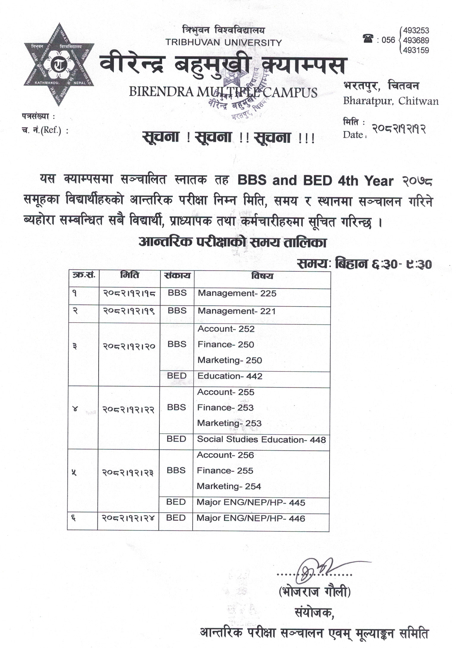 Established on 15 Baishakh 2022 BS as Birendra Intermediate Arts College-named in honor of the late King Birendra-the institution arose from the combined vision of educators, social workers, guardians, philanthropists, and local organizations. They recognized the urgent need for a higher–education facility after Chitwan opened for settlement in 2011 BS and set out to fill that gap. In its earliest days, the college faced many hardships. Without its own campus, it began life holding night classes in the Chitwan High School building with just fourteen students. Before long, it moved into a rented house in Narayangarh, laying the foundation for what would become today’s Birendra Multiple Campus.