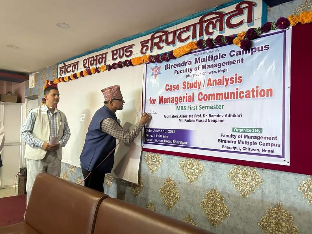 The Faculty of Management at Birendra Multiple Campus organized a workshop on "Case Analysis for Managerial Communication" for MBS first-semester students. The event was attended by Campus Chief Prof. Daya Ram Paudyal, Assistant Campus Chief Mr. Bhanu Bhakta Kandel, Assoc. Prof. Dr. Bamdev Adhikari, Head of the English Department Prof. Dr. Krishna Prasad Paudyal, Head of the Education Department Mr. Padam Prasad Neupane, Program Coordinator Mr. Udaya Kumar Shrestha, faculty member Mr. Sushil Lamichhane, and other faculty members.