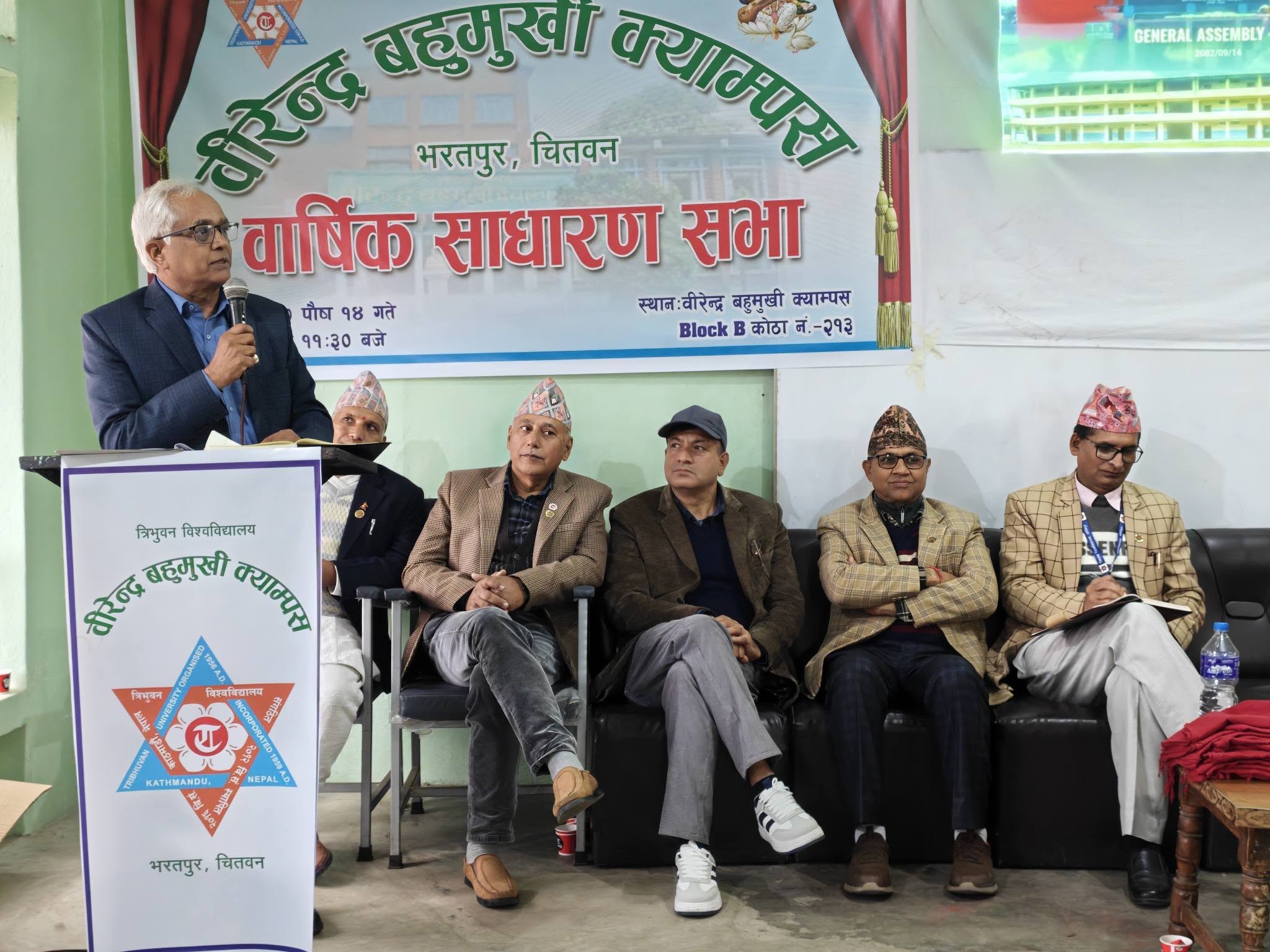 वीरेन्द्र बहुमुखी क्याम्पसको यही मिति २०८२ पौष १४ गते त्रिभुवन विश्वविद्यालयका रजिष्ट्रार प्रा.डा. केदारप्रसाद रिजालको प्रमुख आतिथ्यतामा सम्पन्न भयो । क्याम्पसका क्याम्पस प्रमुख डा. प्रेम सागर भण्डारीको अध्यक्षतामा सम्पन्न भयो । सहायक क्याम्पस प्रमुख टिकाराम रिजालले सञ्चालन गर्नुभएको उक्त सभामा सहायक क्याम्पस प्रमुख डा. किशोरचन्द्र घिमिरेले स्वागत मन्तव्य राख्नुभएको थियो । सभामा क्याम्पसका पूर्व क्याम्पस प्रमुखहरु प्रा. दयाराम पौडेल, प्रा.डा. केशवभक्त सापकोटा र सहप्रा. प्रेमराज खनियाँ, सहायक क्याम्पस प्रमुखहरु, विद्यार्थी कल्याण प्रमुख, कार्यरत प्राध्यापकहरु, कर्मचारी तथा अध्ययनरत विद्यार्थी प्रतिनिधिहरुको उपस्थिति रहेको थियो ।