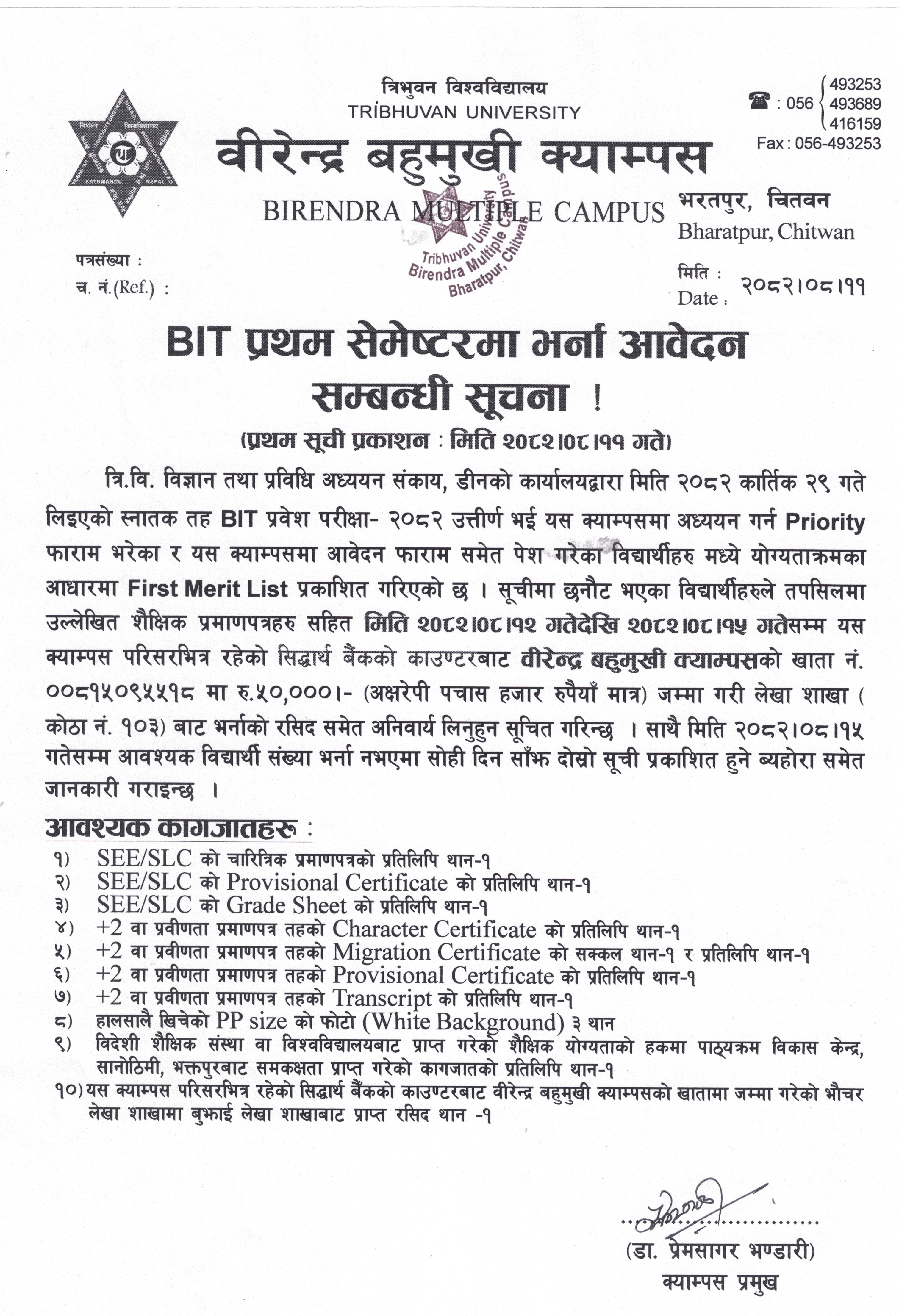 BIT प्रथम सेमेष्टरमा खुल्ला कोटाको भर्नाका लागि नामावली प्रकाशन सम्बन्धी सूचना