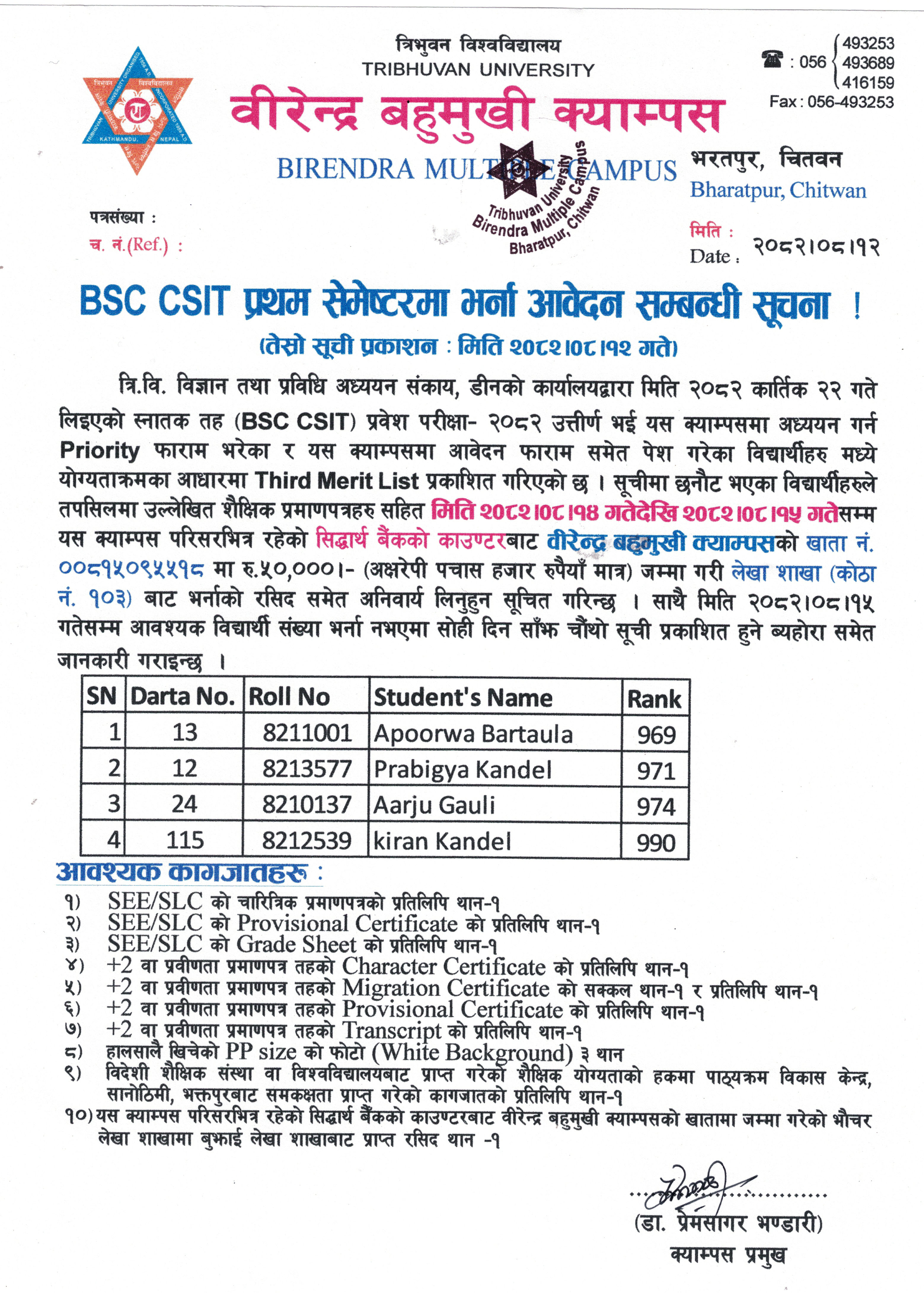 BSC CSIT प्रथम सेमेष्टरमा खुल्ला तर्फ (3rd Merit List) मा भर्नाका लागि नामावली प्रकाशन सम्बन्धी सूचना !!!
