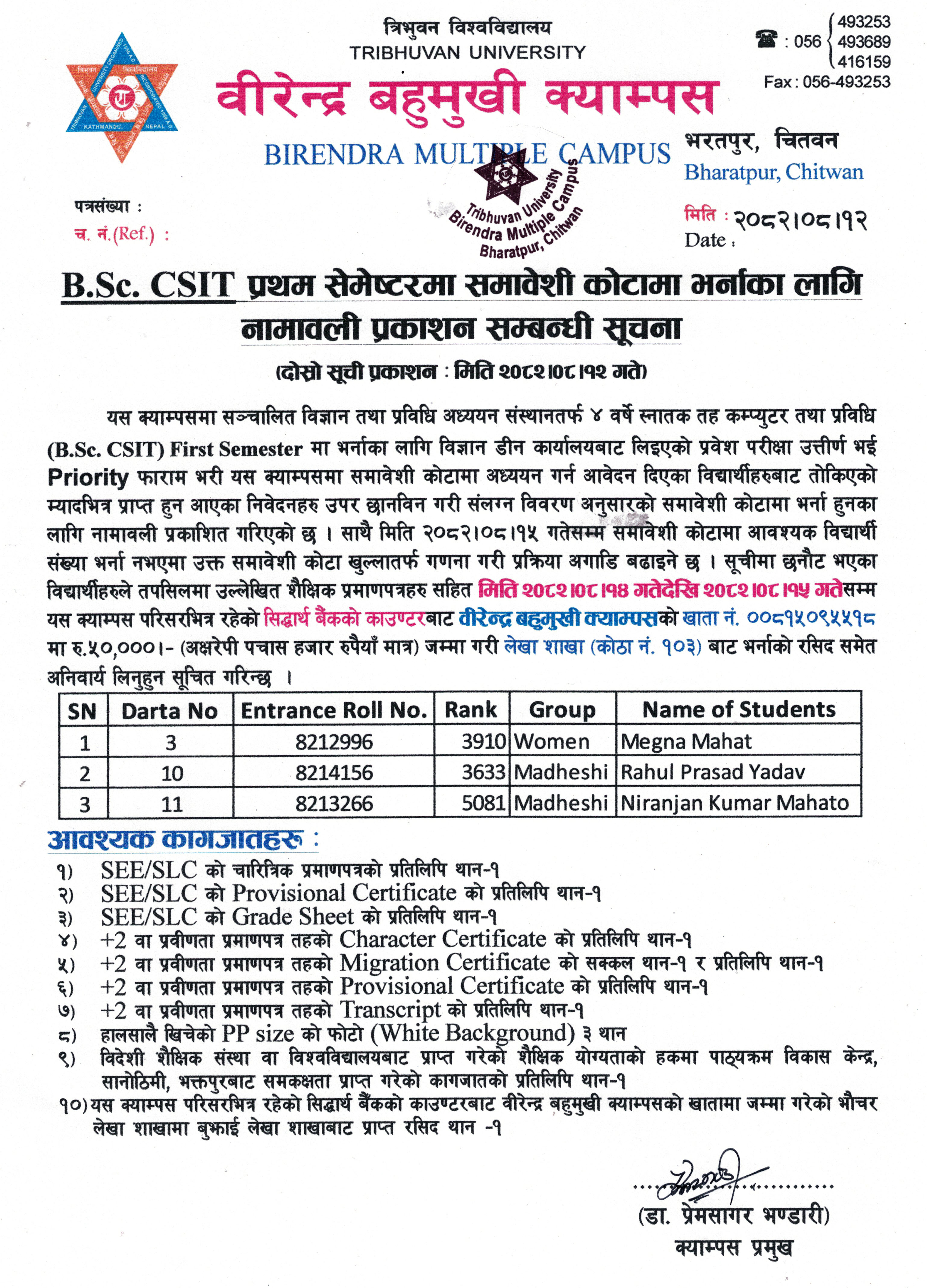 BSC CSIT प्रथम सेमेष्टरमा समावेशी कोटा तर्फ (2nd Merit List) मा भर्नाका लागि नामावली प्रकाशन सम्बन्धी सूचना !!!