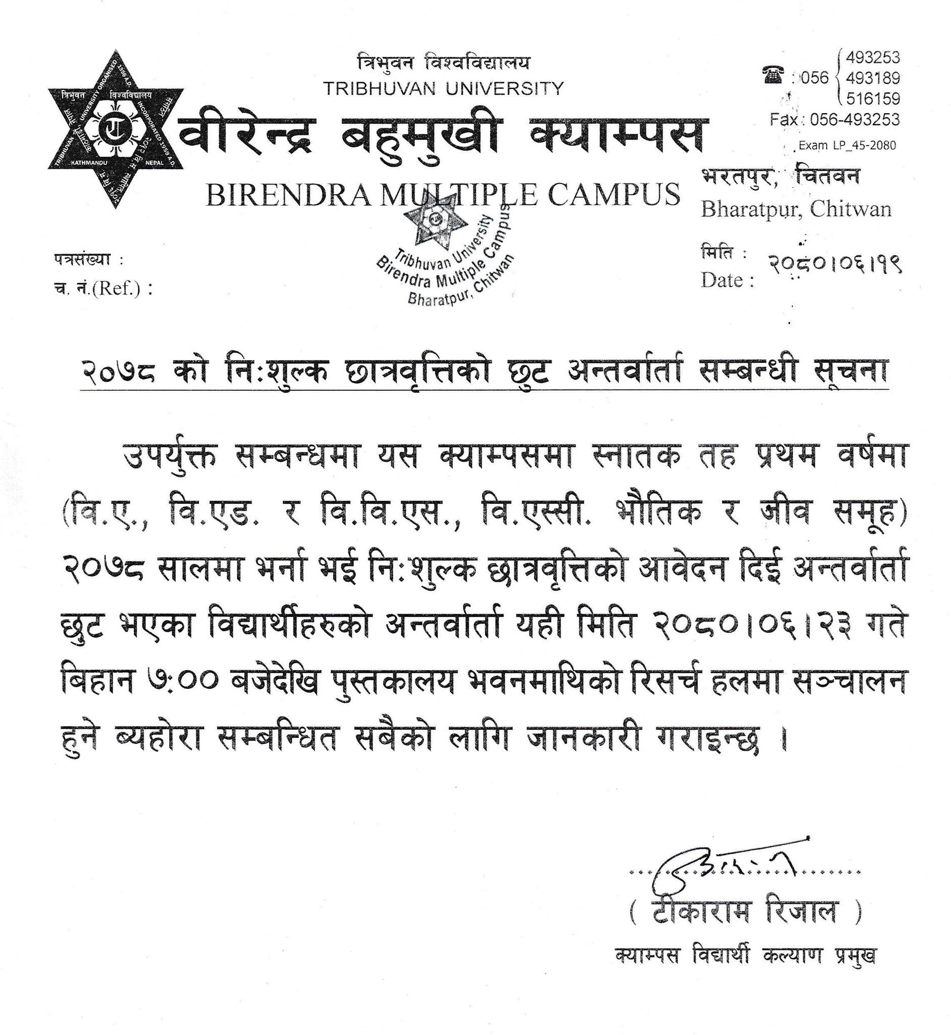 २०७८ को निशुल्कः क्षात्रबृतिको छुट अन्तर्वार्ता सम्बन्धी सूचना