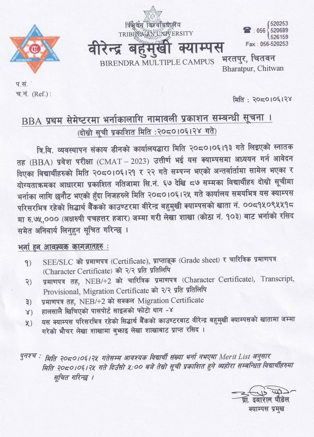 Admission Notice for BBA -2023 Batch - Second List
