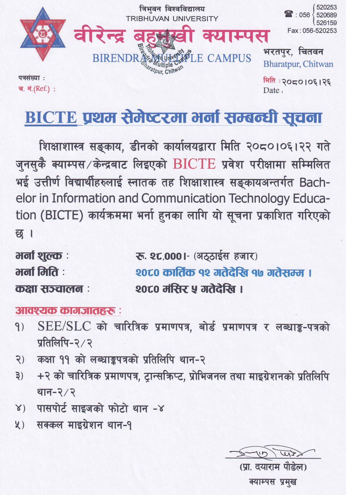 BICTE 2080 Admission Notice