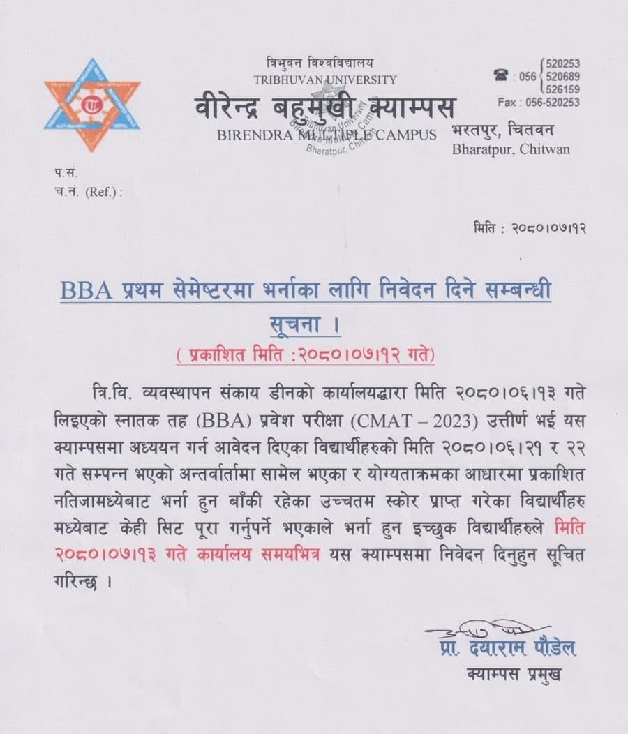 BBA प्रथम सेमेष्टरमा भर्नाका लागि पुन निवेदन माग सम्बन्धी सूचना