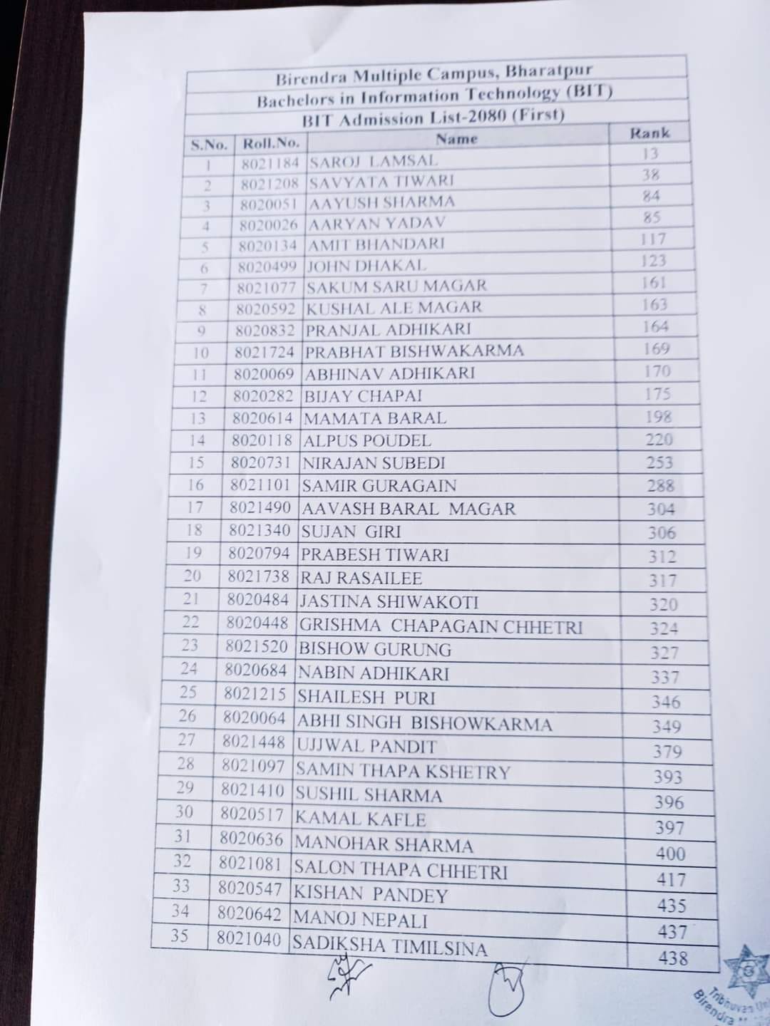 BIT First Admission List