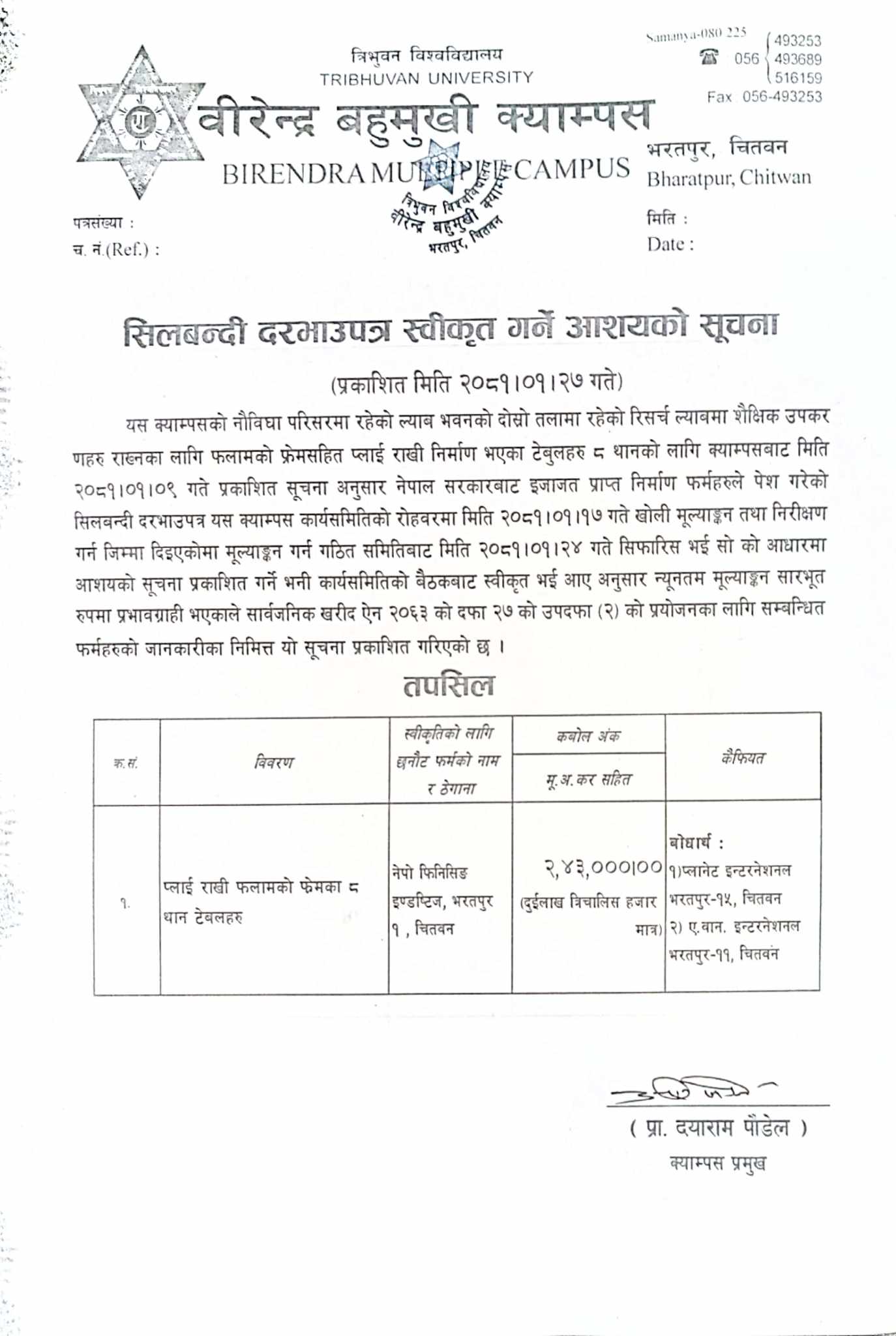 शिलबन्दी दरभाउपत्र स्वीकृति गर्ने आशय को सूचना