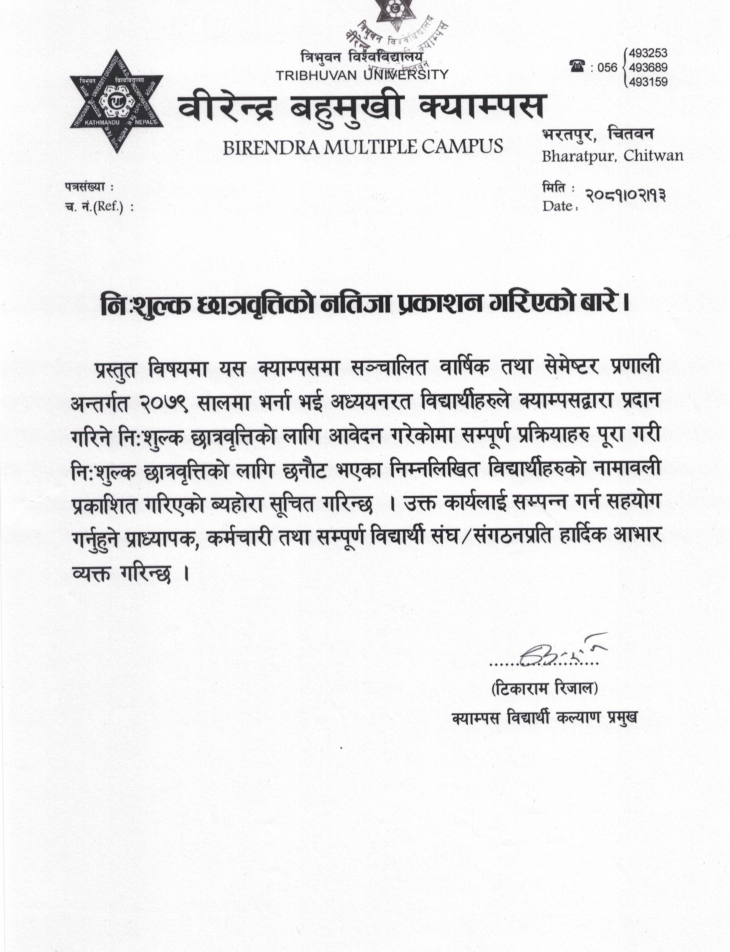 निशुल्क छात्रवृत्तिको (२०७९ ब्याच) नतिजा प्रकाशन गरिएको बारे