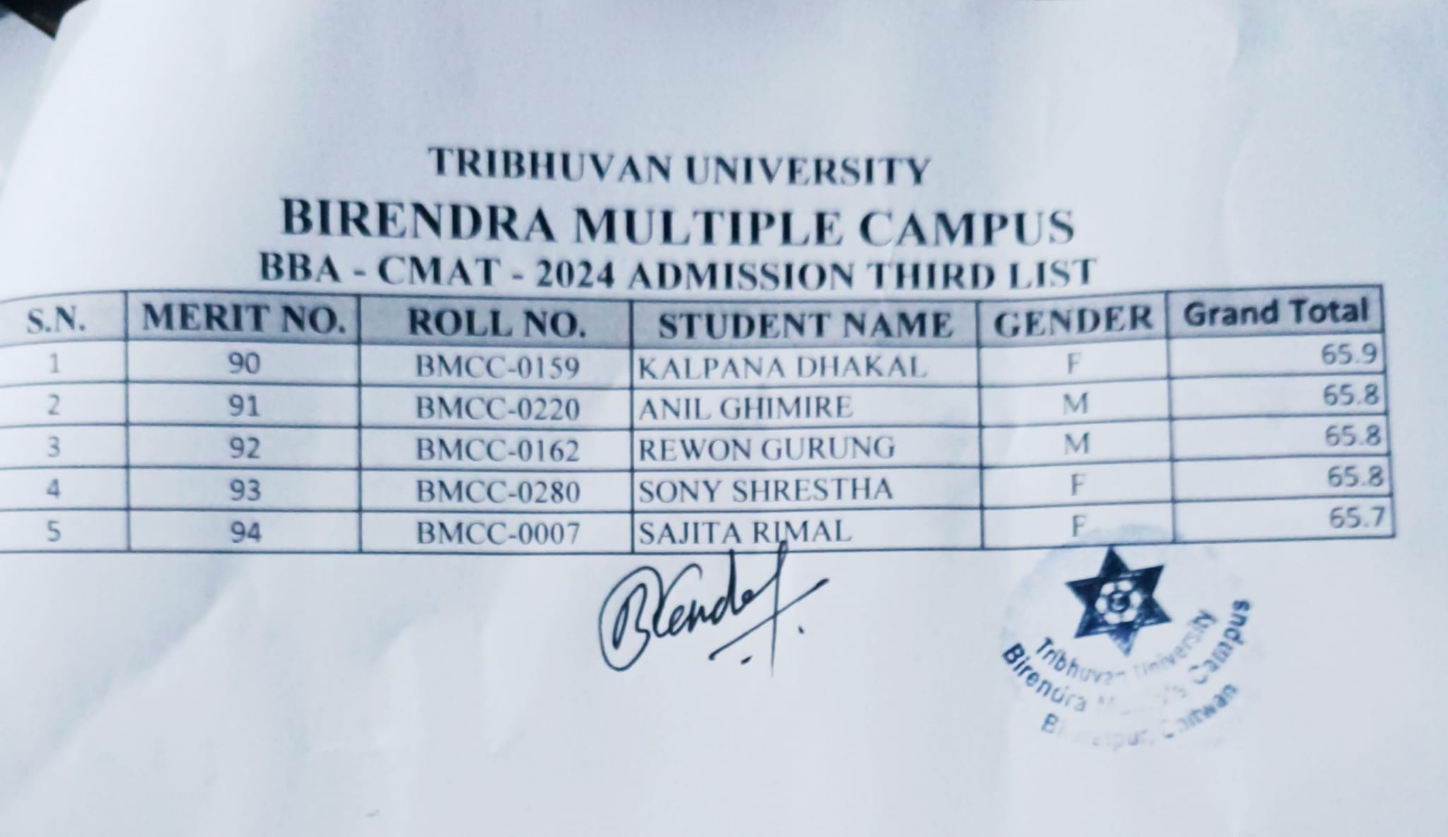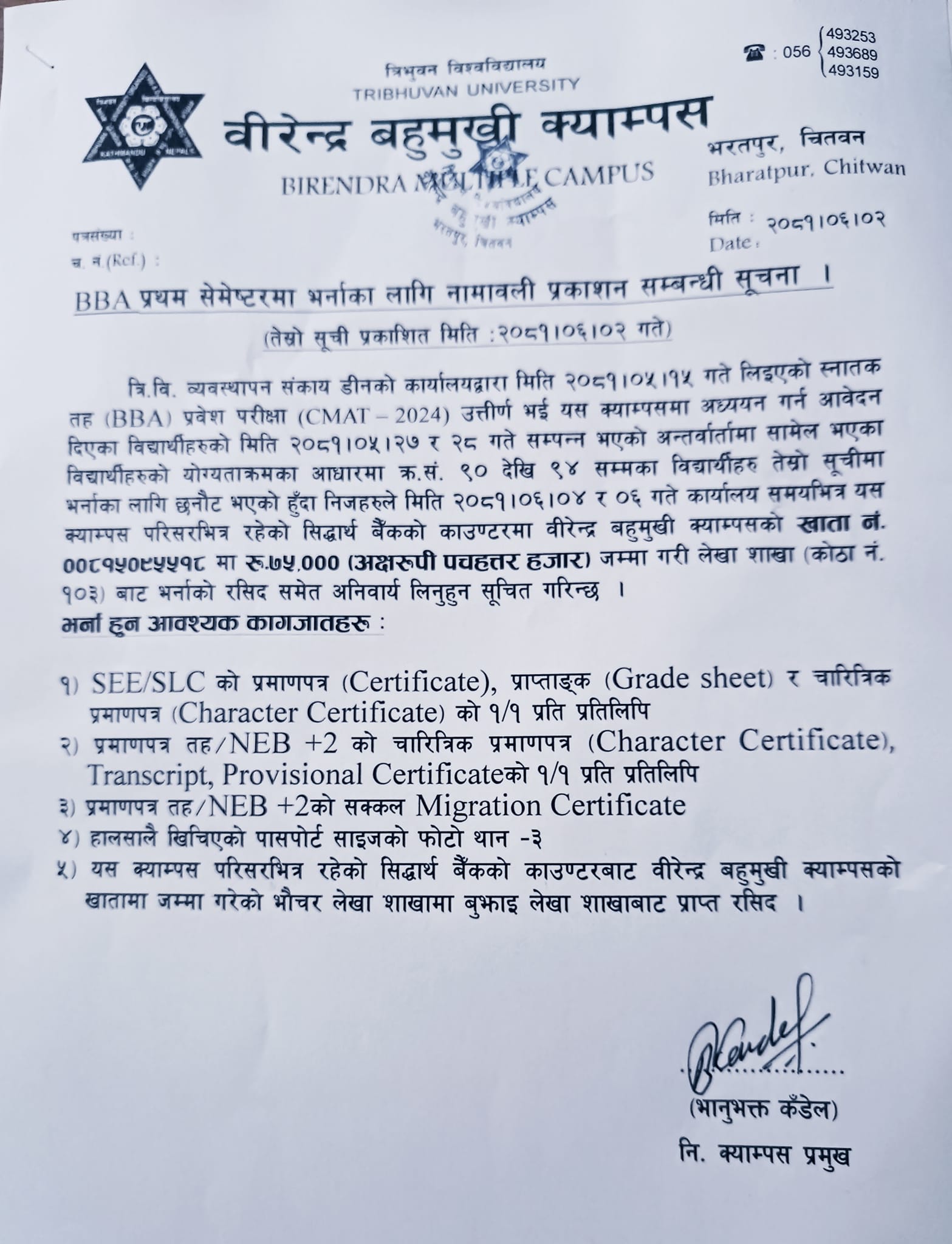 BBA प्रथम सेमेस्टरमा भर्नाका लागि नामावली प्रकाशन सम्बन्धी सूचना - तेश्रो सूची