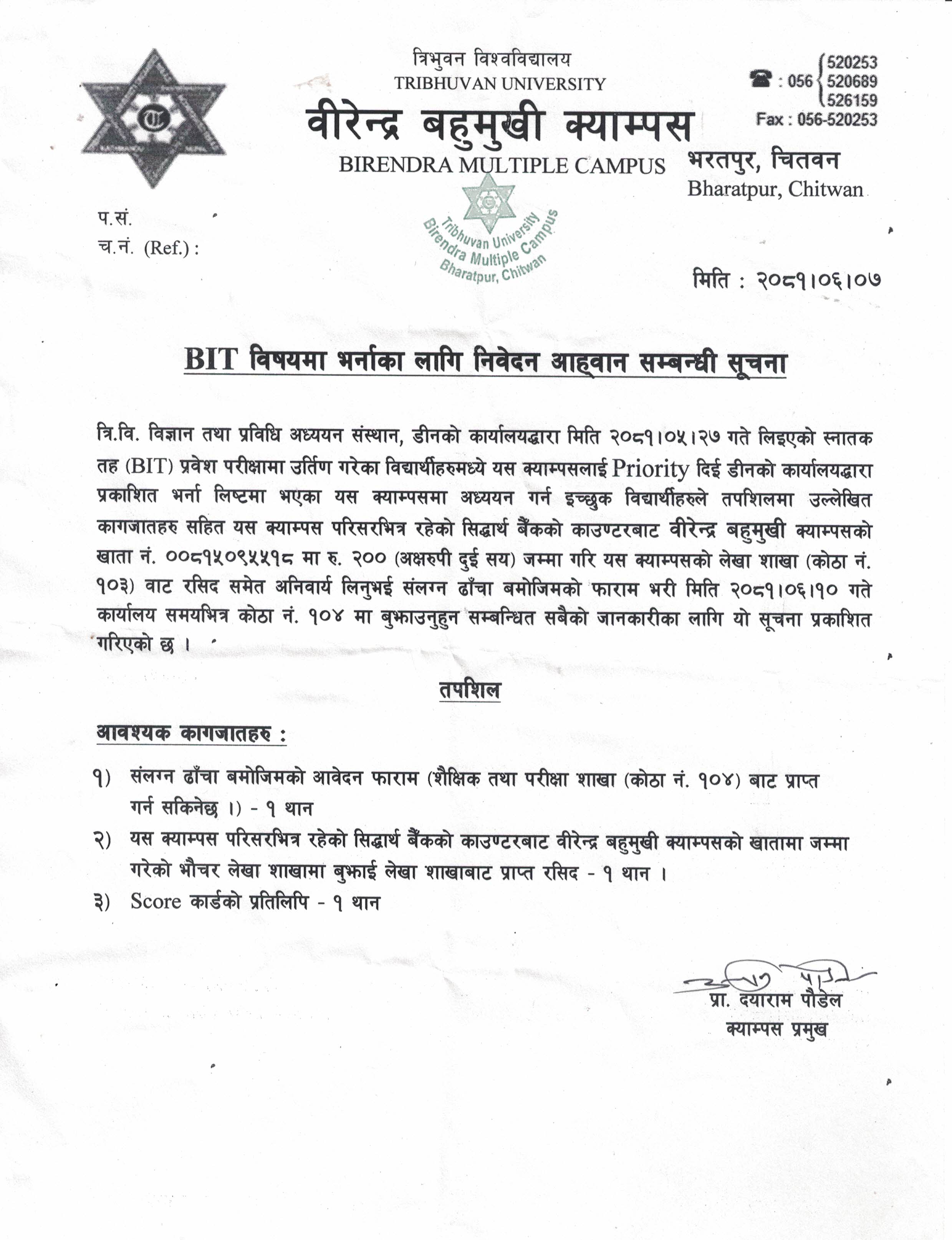 BIT प्रथम सेमेस्टरको भर्नाका लागि आवेदन आह्वान