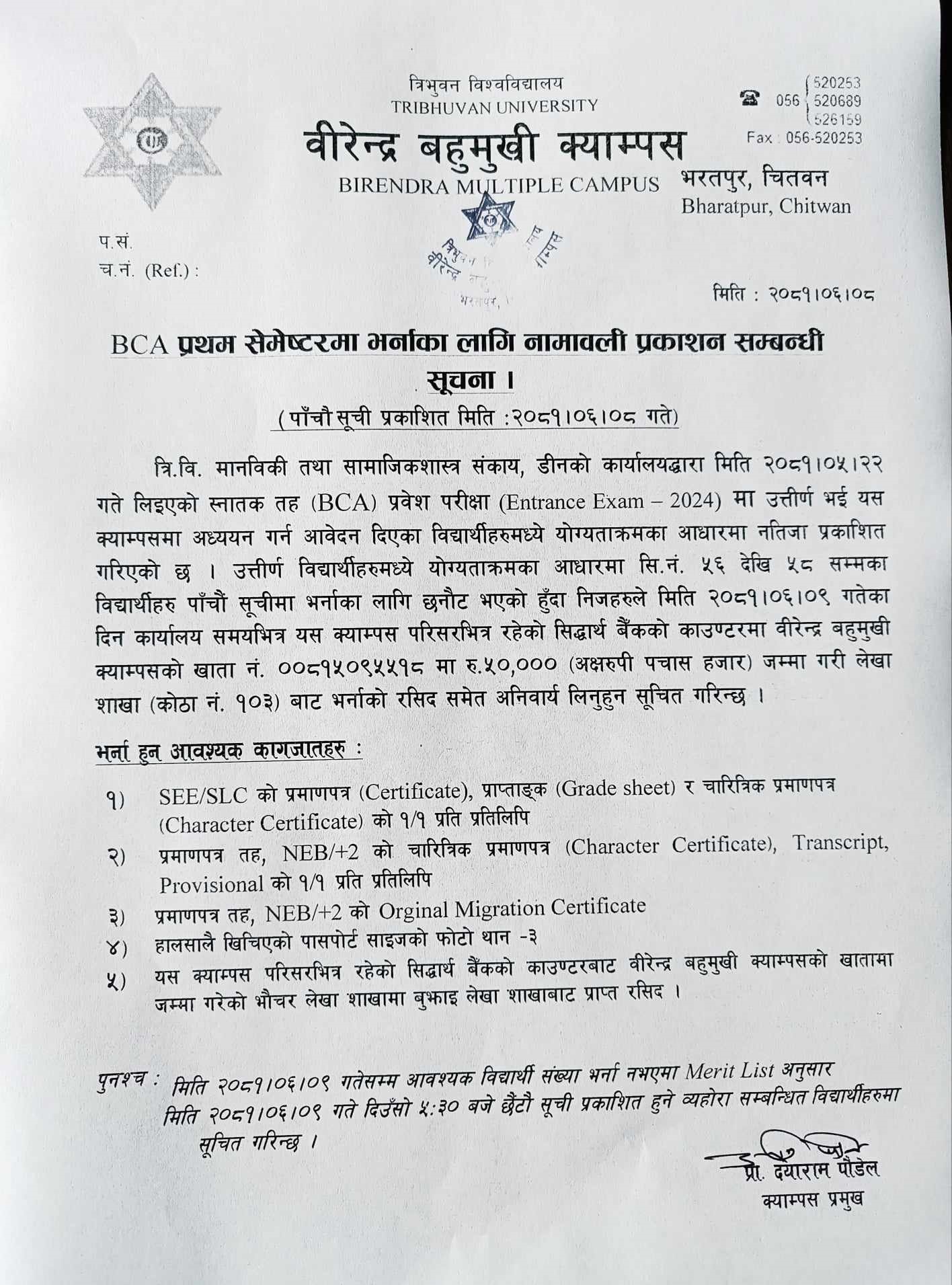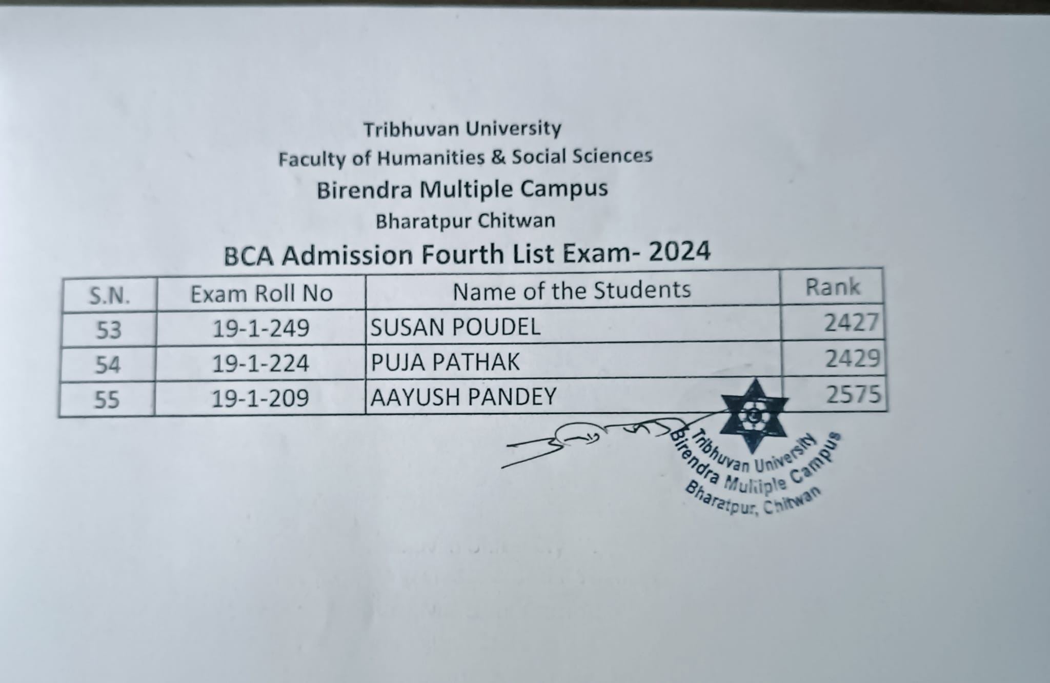 BCA प्रथम सेमेस्टरमा भर्नाका लागि नामावली प्रकाशन सम्बन्धी सूचना - चौथो सूची