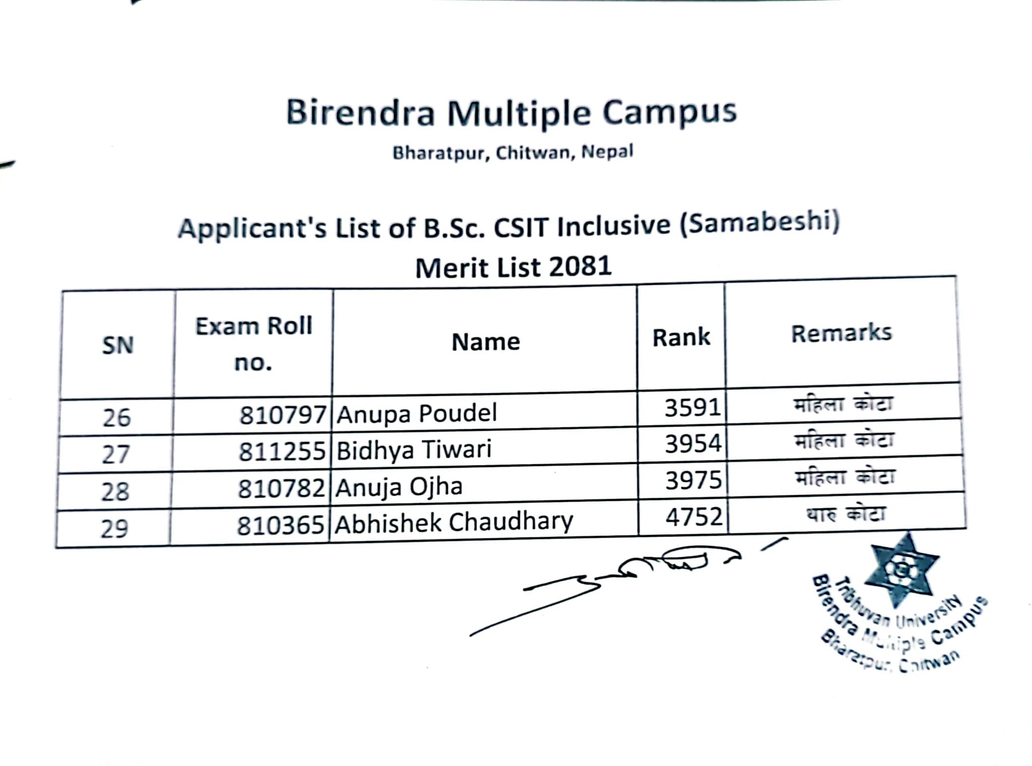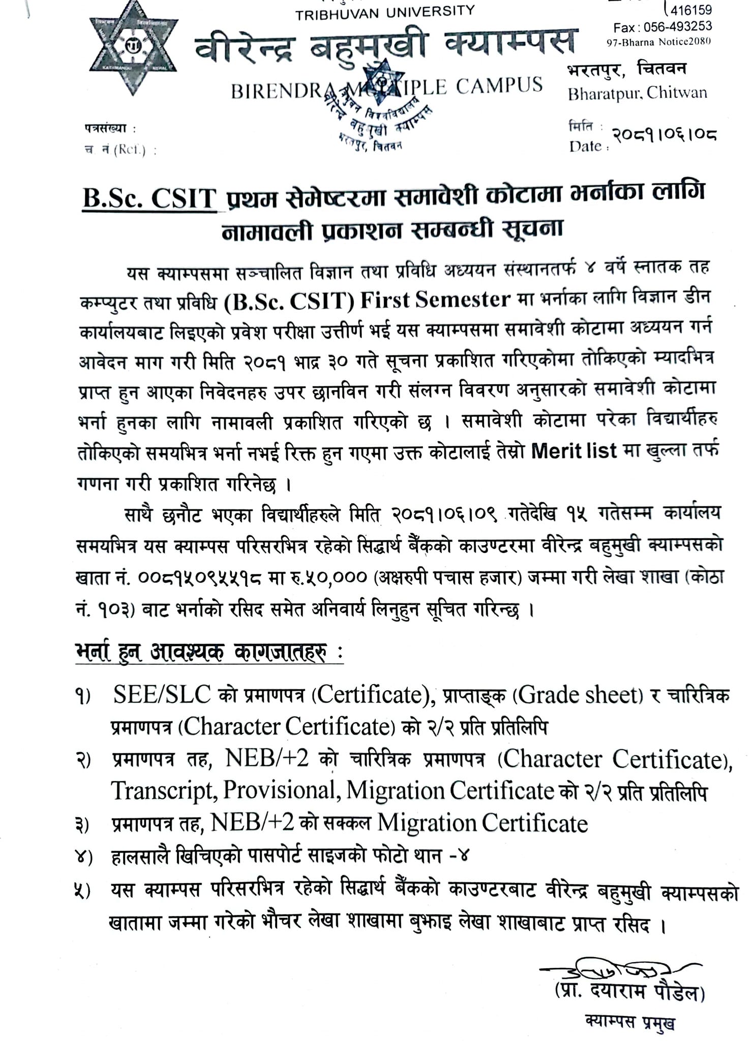 B.Sc. CSIT प्रथम सेमेस्टरमा समाबेशी कोटामा भर्नाका लागि नामावली प्रकाशन सम्बन्धी सूचना