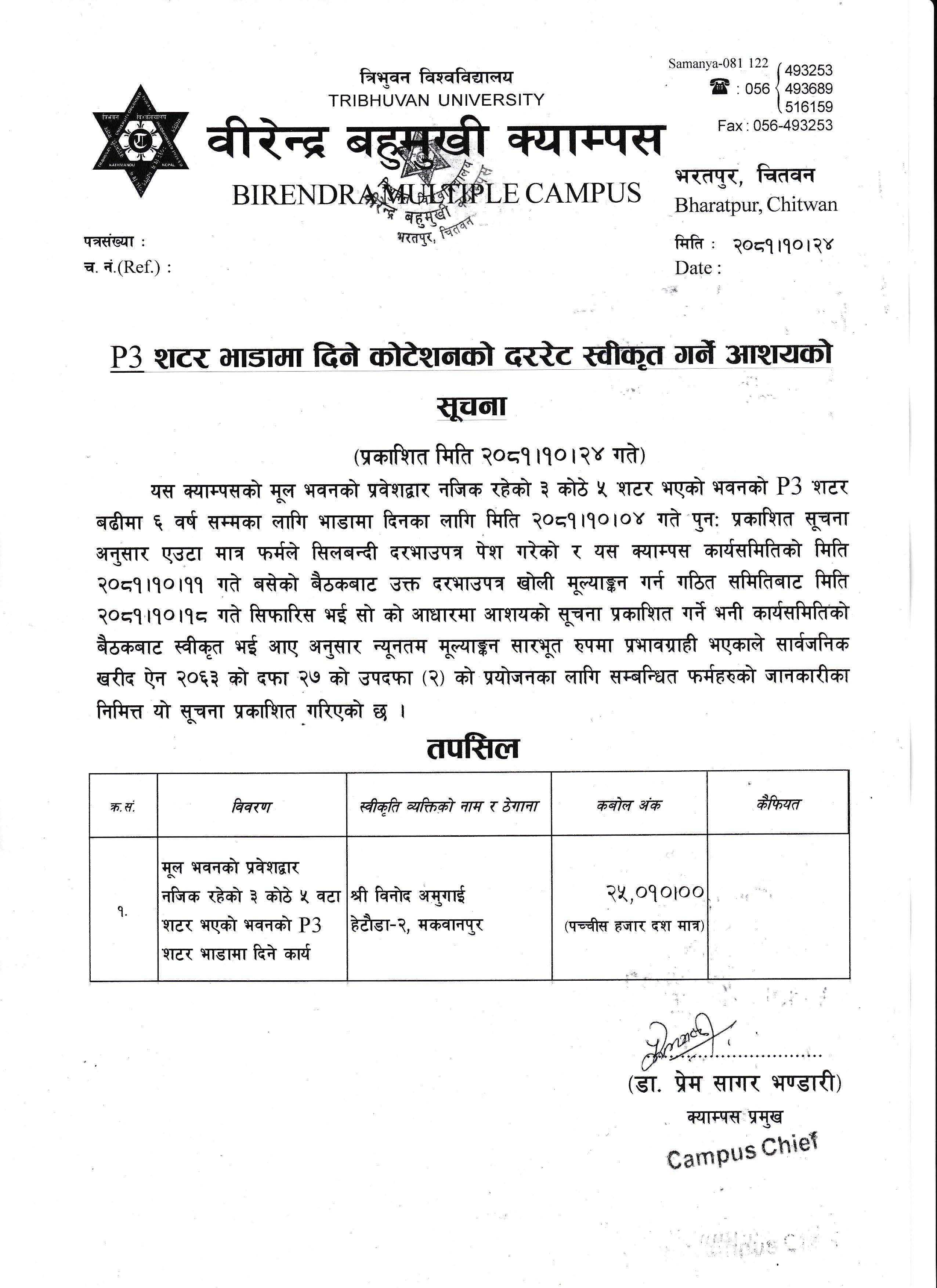 P3 शटर भाडामा दिने कोटेशनको दररेट स्वीकृति गर्ने आशयको सूचना