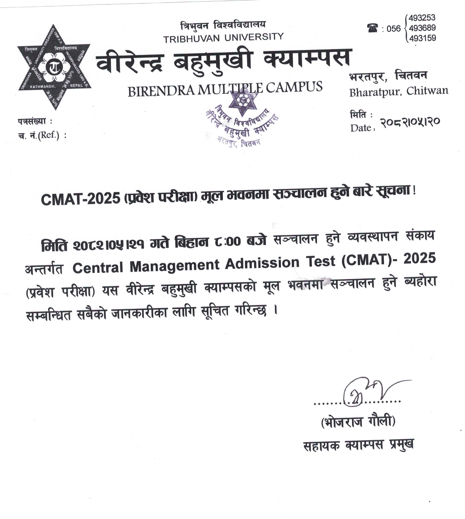 CMAT-2025 (प्रवेश परीक्षा) मूल भवनमा सञ्चालन हुने बारे सूचना !!!