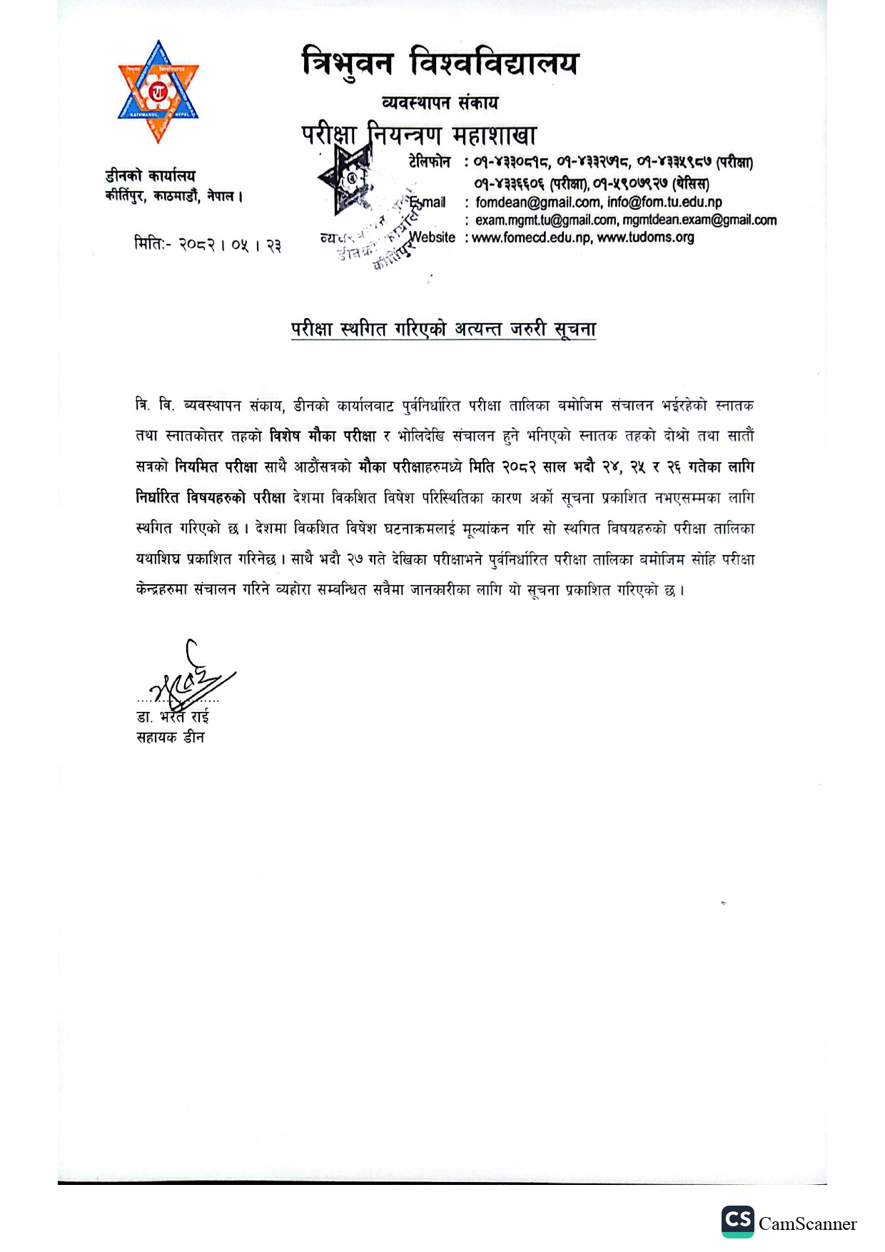 भाद्र २४, २५ र २६ गतेका परीक्षाहरु (परीक्षा नियन्त्रण कार्यालय बल्खु तथा मानविकी र व्यवस्थापन डीनको कार्यालयद्बारा सञ्चालित) स्थगित सम्बन्धी जरुरी सूचना !!!!