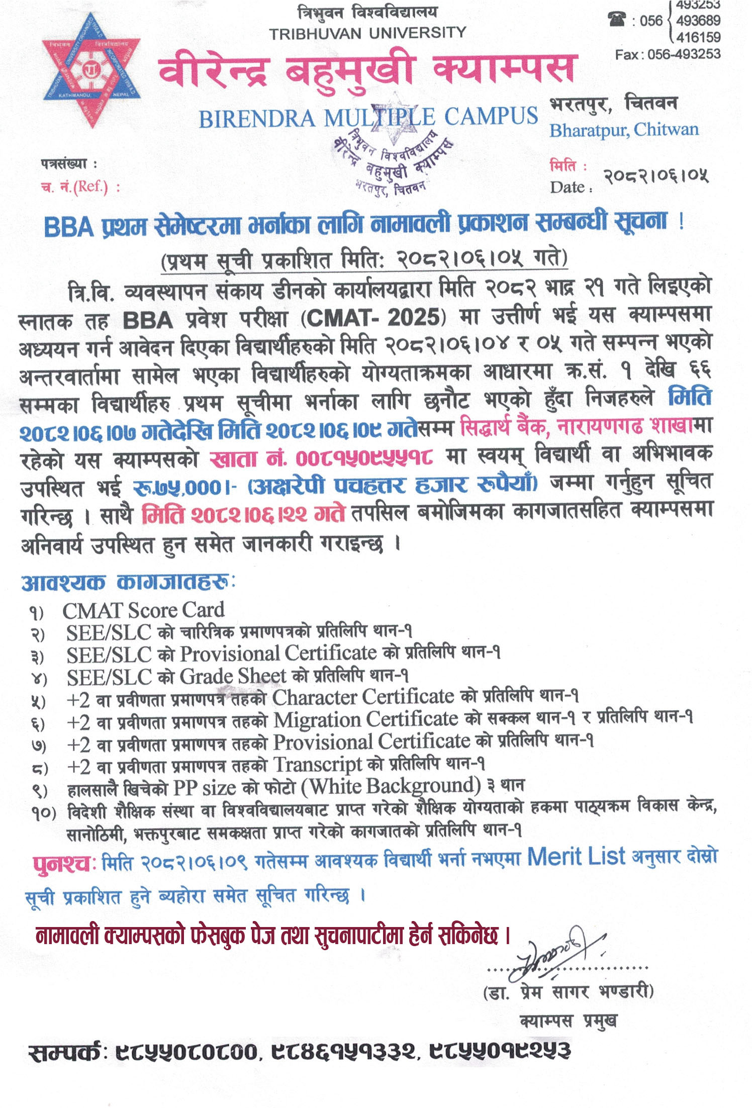 BBA प्रथम सेमेष्टरमा भर्नाका लागि नामावली प्रकाशन सम्बन्धी सूचना !