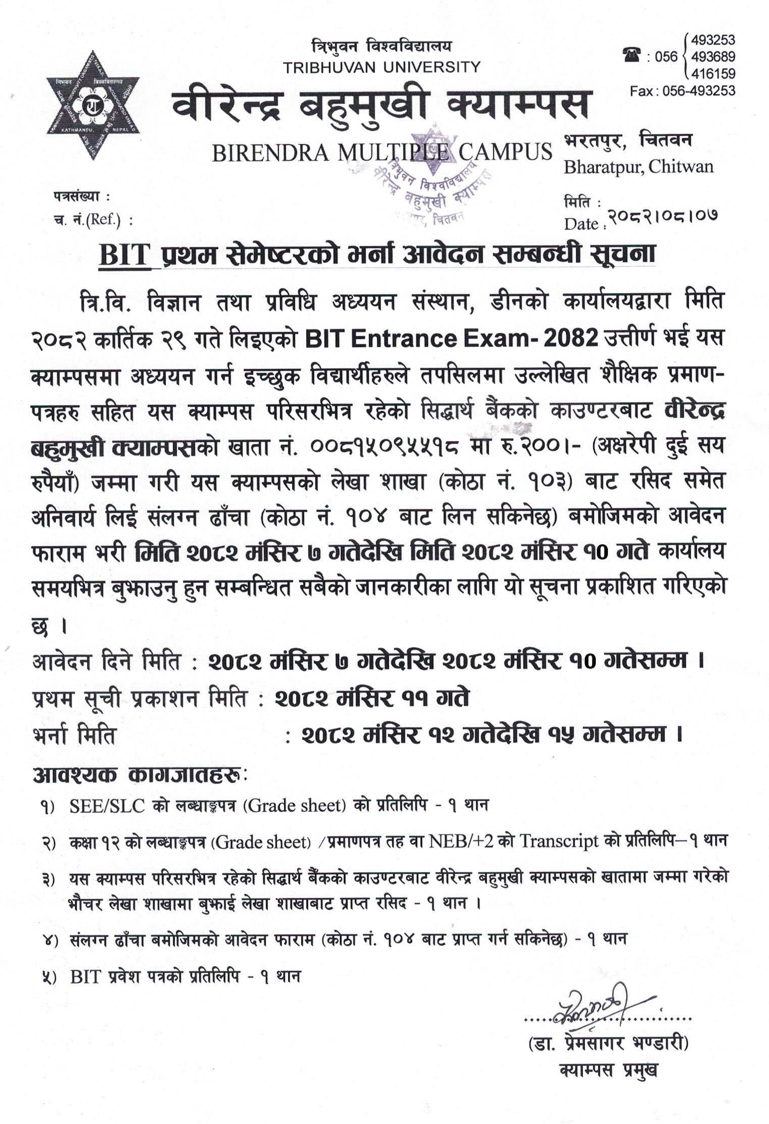 BIT प्रथम सेमेष्टर, 2082 को भर्ना आवेदन सम्बन्धी सूचना